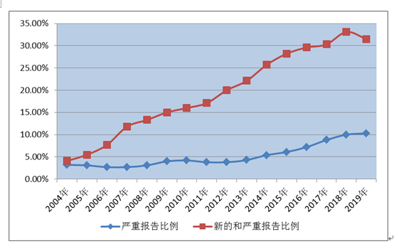 圖2 2004年-2019年新的和嚴重以及嚴重藥品不良反應/事件報告比例