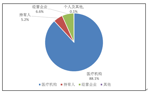 持有人、經(jīng)營企業(yè)和醫(yī)療機構(gòu)是藥品不良反應報告的責任單位。按照報告來源統(tǒng)計,2019年來自醫(yī)療機構(gòu)的報告占88.1%;來自經(jīng)營企業(yè)的報告占6.6%;來自持有人的報告占5.2%;來自個人及其他報告者的報告占0.1%(圖3)。