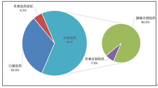 按照藥品給藥途徑統(tǒng)計,注射給藥占67.0%、口服給藥占30.1%、其他給藥途徑占2.9%(圖16)。注射給藥中,靜脈注射給藥占92.7%、其他注射給藥占7.3%。