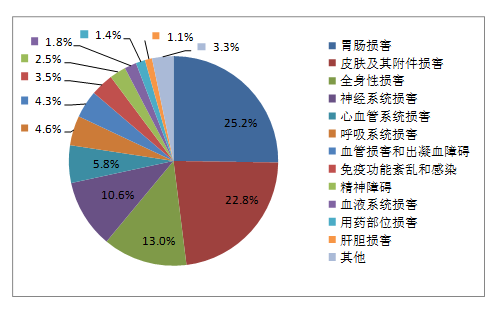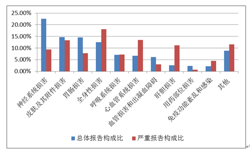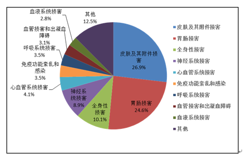 2019年國家基本藥物化學藥品和生物制品不良反應/事件報告,按照藥品類別統(tǒng)計,報告數(shù)量排名前5位的分別是抗微生物藥、心血管系統(tǒng)用藥、抗腫瘤藥、激素及影響內(nèi)分泌藥、治療精神障礙藥;累及器官系統(tǒng)排名前5位的是皮膚及其附件損害、胃腸損害、全身性損害、神經(jīng)系統(tǒng)損害以及血液系統(tǒng)損害。